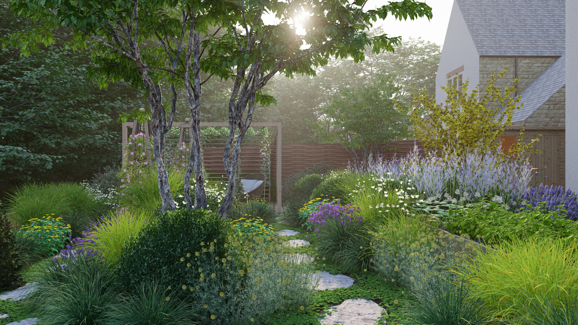 The design brief here included harnessing the views from key vantage points in the garden; a lower seating area to capture the best sun and views across the meadow and ridge and an extended terrace with plenty of room to sit, dine and grow salad vegetables, herbs and flowers. Our aim was to connect with the natural space outside of the garden by echoing its structural planting features inside the garden. A matrix of different meadow grasses nod to the meadow beyond, while multi stem trees pick out the shapes of trees and shrubs on the horizon. The front garden was redesigned to create extra room for parking and a small gravel garden for heat loving and drought tolerant plants in this little sun trap.