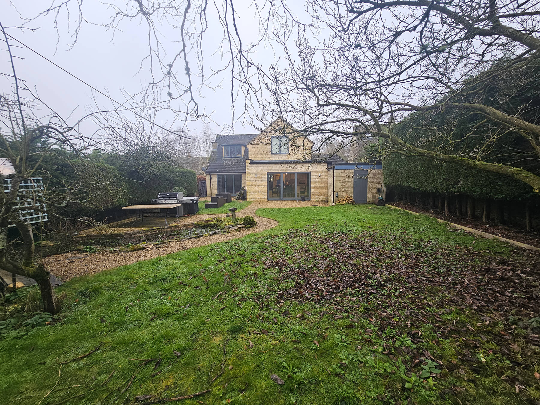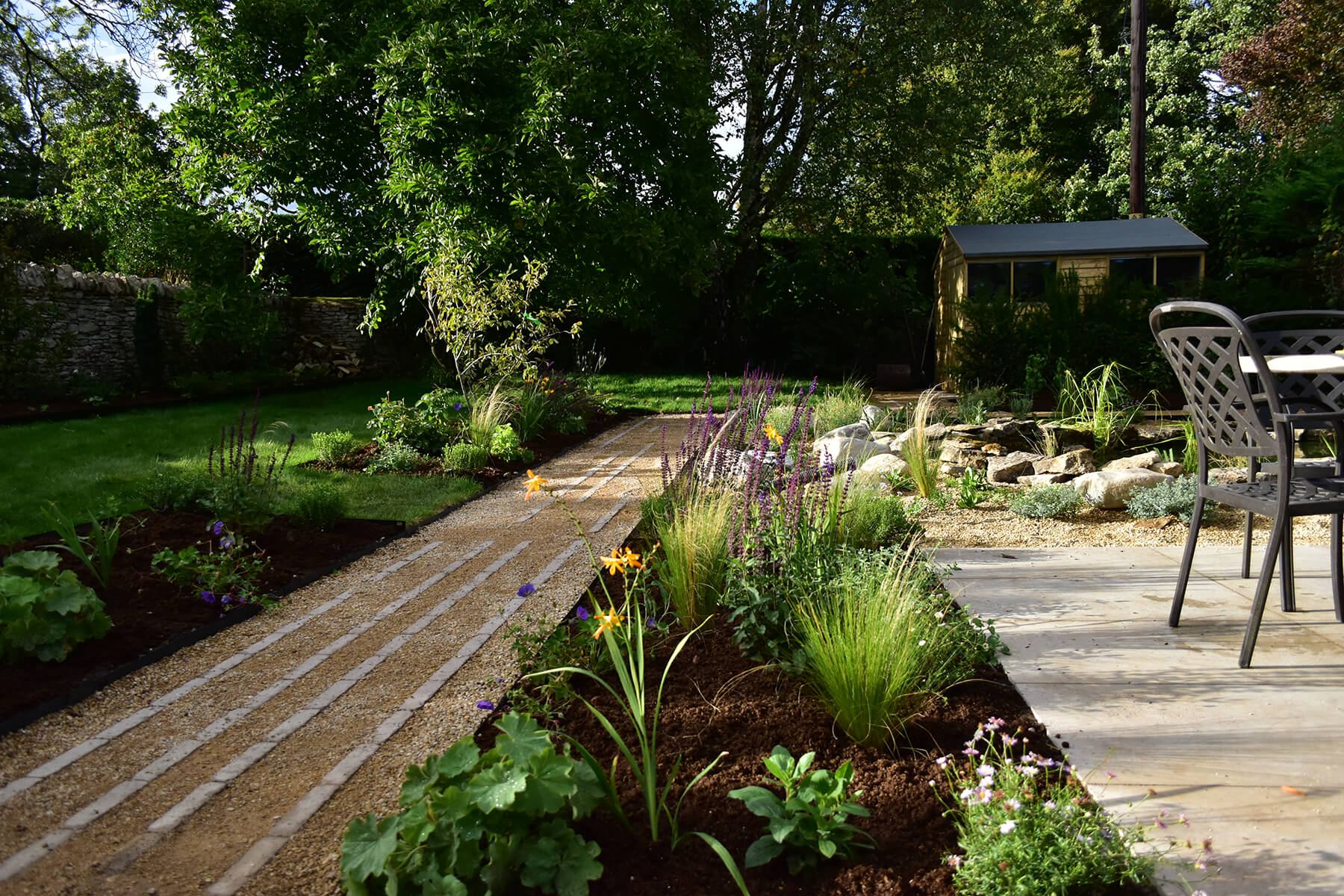 This design focuses on drawing you through the garden literally and visually by creating strong axes and zones inspired by the house and its materials. Large format natural limestone paving wraps around the building and is contrasted with pale grey clay pavers leading directly from the centre of the house doors in a stacked ‘runner’ pattern before breaking out along a self-binding gravelled path up the centre of the garden towards its wilder side where the pond sits nestled in a gravel planted ‘beach’. The main seating terrace away from the house takes advantage of the sun, overlooks the pond and is surrounded by layers of planting including raised aluminium planters filled with fragrant herbs and colour matched to the new doors and windows. The new shed is screened by native Yew hedging and along the boundary wall a deep bed filled with layers of seasonal planting.
